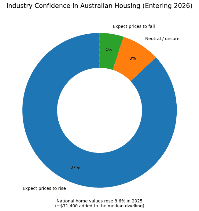 Despite global uncertainties, confidence in Australia’s housing market is surprisingly strong as we enter 2026. New industry research shows 87% of property professionals expect prices to rise in the year ahead. In fact, national dwelling values jumped 8.6% in 2025 – a median gain of about $71,400 – reflecting broad-based growth across cities. However, these national averages hide big local differences. The overall market remains firm, but state-by-state sentiment is diverging as affordability and policy pressures bite.