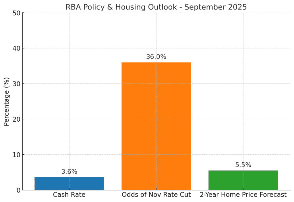 The Reserve Bank of Australia (RBA) left the cash rate unchanged at 3.60% in its September meeting. Governor Michele Bullock emphasised the Board’s cautious, data-driven approach – staying at current rates “meeting by meeting” and monitoring inflation trends. In fact, RBA minutes noted inflation is still above target and that the “decline in underlying inflation has slowed,” underscoring the need for caution. As a result, markets have scaled back expectations of an early cut – the odds of a November rate cut have plunged following the RBA statement.
