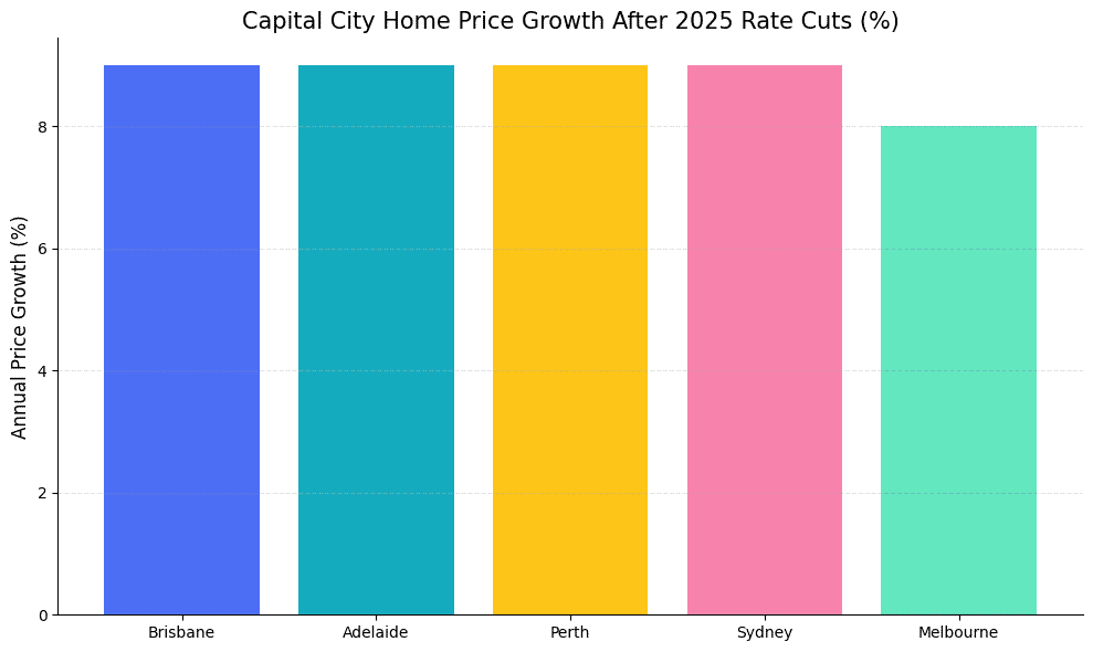 By late 2025, home values had climbed about 9% across combined capital cities (units ~7%), marking 11 straight quarters of growth – the longest run since 2012–15. Strong demand outpaced supply nationwide: median Brisbane, Adelaide and Perth house prices each rose roughly 9% on the year, vaulting them into the upper ranks for affordability (Perth and Adelaide hit new highs, Brisbane passed $1m). Even traditionally strong markets like Sydney and Melbourne saw sharp gains. In short, “rate cuts finally arrived this year, but they didn’t solve for affordability – they actually pushed prices even higher,” as industry economists observe.