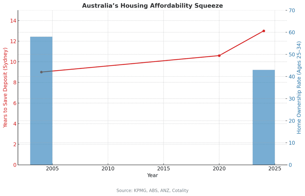 Research from ANZ and Cotality now points out that Sydney buyers need a whopping 13 years to save a 20% deposit. That’s a jump from 9 years only two decades ago. Even during the post-COVID wage bumps in the last three years, the wait only reduced to a still-painful 10.6 years. Meanwhile, the average home is now a daunting eight times the average wage, as the ABS highlights. This lethal combination has slammed home ownership among 25 to 34-year-olds, which now sits at only 43% a severe decline from 58% of market share in 2003-2004. source