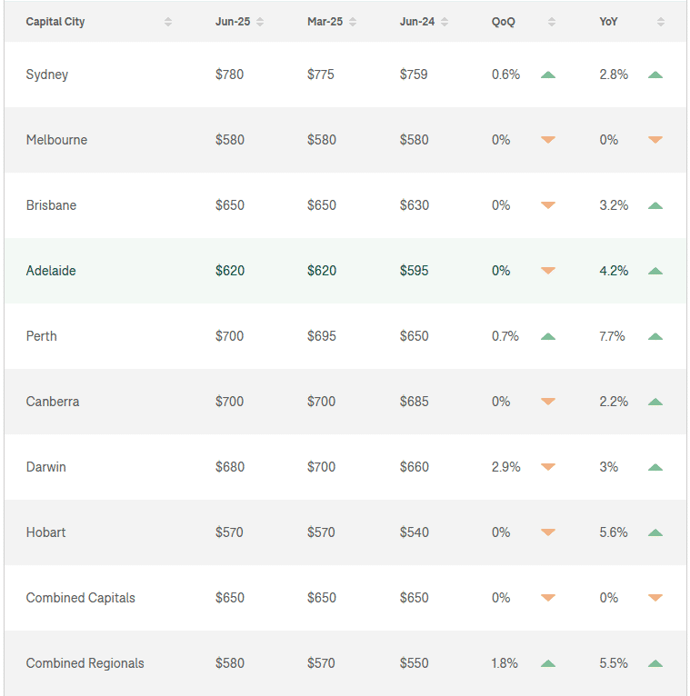 The above table offers a snapshot of median dwelling values across various Australian capital cities, as well as combined capital and regional areas. It compares values for June 2025, March 2025, and June 2024 to illustrate market performance. The data includes both quarterly (QoQ) and yearly (YoY) percentage changes, with visual indicators highlighting increases or decreases. Key insights from the table include Perth showing the strongest annual growth at 7.7%, while several cities like Melbourne, Brisbane, and Canberra show no quarterly change. The combined regional areas demonstrate robust growth, with a 1.8% increase quarter-on-quarter and a 5.5% increase year-on-year, outperforming the combined capitals.