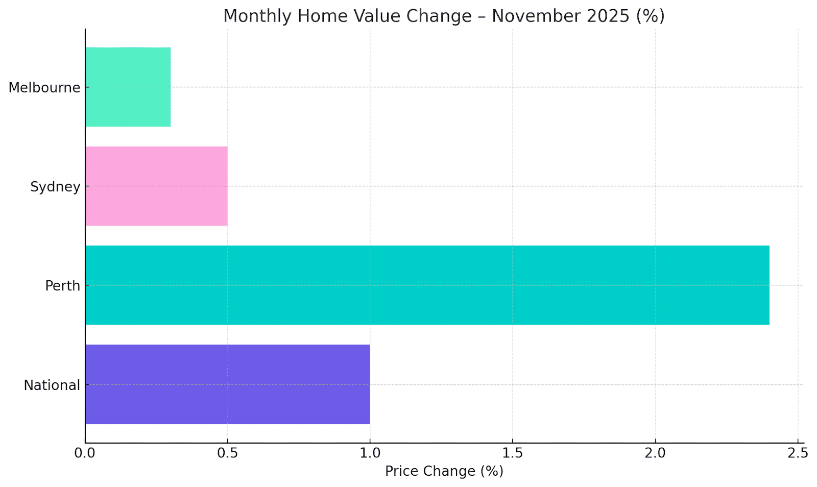 According to the latest Cotality data, national home values have recorded modest growth in recent months, signalling that price momentum is easing after a strong run. Growth has been strongest in smaller capitals — Perth led recent gains with a sharp monthly lift, while Sydney and Melbourne recorded much slower increases amid affordability constraints. From a buyer’s agent perspective, this points to a diverging market: mid-sized cities continue to drive growth, while major capitals are showing signs of price fatigue. Auction clearance rates in Sydney and Melbourne have slipped into the low-60% range, indicating softer buyer demand.
