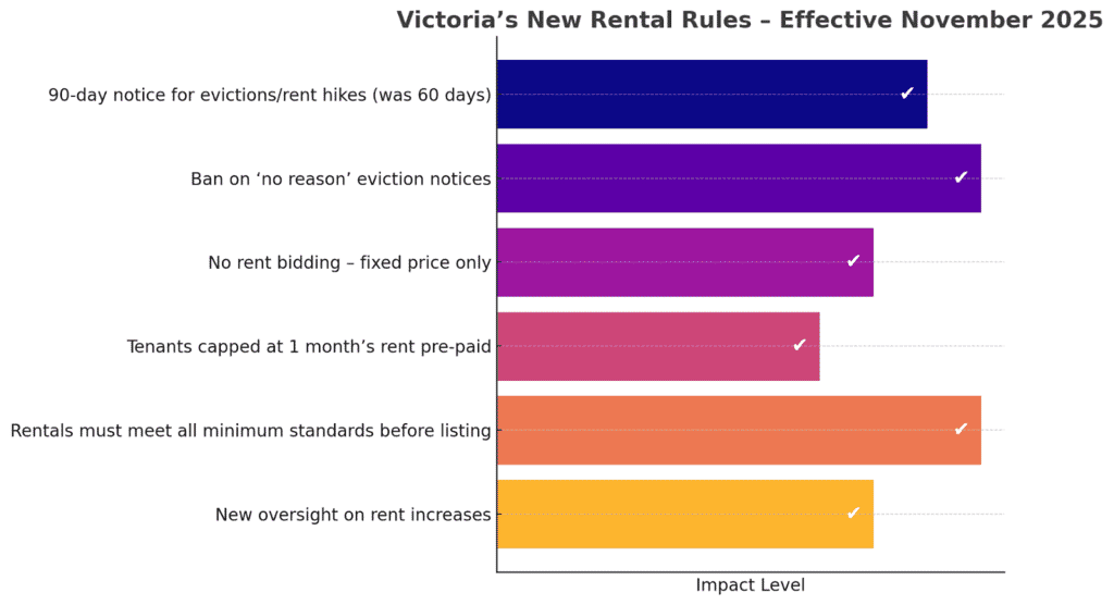 From November 2025, Victoria will introduce tougher rental rules. Landlords must now give 90 days’ notice (up from 60) and can’t evict tenants without a valid reason. Agents must list only a fixed rent price – all “rent bidding” (offers above asking) is banned. Tenants may pay no more than one month’s rent in advance. Every rental home must meet strict health and safety standards before being advertised. In practice, this means property managers face heavy compliance work and extra rules on rent increases (new factors must justify any rise).